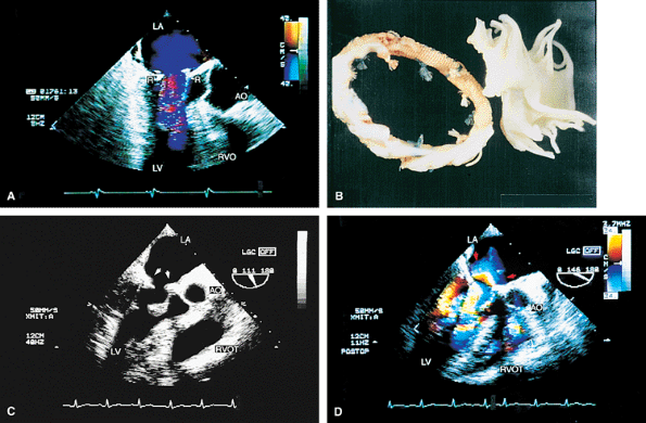 FIGURE 5.12. Mitral annuloplasty rings. A. R points to the Carpentier ring in the mitral position. There is no obstruction to mitral flow. B. Gross specimen of Carpentier ring.C,D. Duran ring in the mitral position (arrows in C). D. Color Doppler examination shows prominent flow acceleration and aliased flow resulting from narrowing of the mitral orifice by the ring. AO, aorta; LA, left atrium; LV, left ventricle; RVO, RVOT, right ventricular outflow tract. |