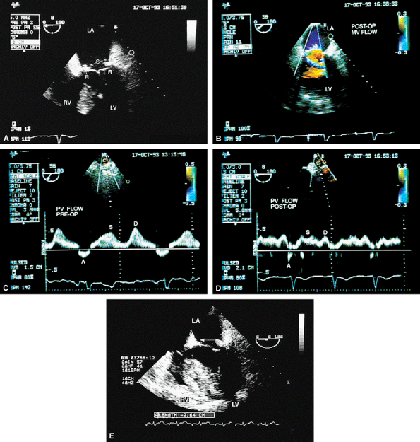FIGURE 5.13. Mitral annuloplasty ring. A. R demonstrates an annuloplasty ring in the mitral position. S, sutures. B. Color Doppler examination shows aliased inflow signals and prominent diastolic flow acceleration (arrow) produced by narrowing of the mitral orifice by the ring. C. Pulsed-Doppler examination of the left upper pulmonary vein (PV) shows a smaller S wave than D wave, consistent with moderate mitral regurgitation (MR) preoperatively. After ring placement, the S wave is equal to the D wave, suggesting a reduction in mitral regurgitation (in D). E. Another patient in whom the annulus size was reduced to 2.64 cm after placement of an annuloplasty ring for severe MR. LA, left atrium; LV, left ventricle, RV, right ventricle. |