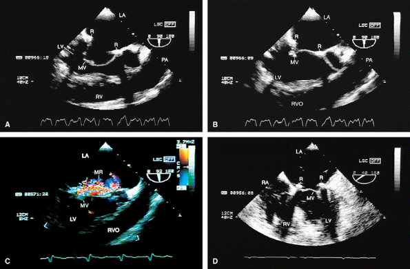 FIGURE 5.14. Mitral annuloplasty ring. The ring (R) is seen in diastole in A and in systole in B. C. Color Doppler examination shows moderate residual mitral regurgitation (MR) in this patient, who had severe MR before ring placement. D. A systolic frame shows ring (R) echoes in another patient following mitral annuloplasty. LA, left atrium; LV, left ventricle; MV, mitral valve; PA, pulmonary artery; RV, right ventricle; RVO, right ventricular outflow tract. |