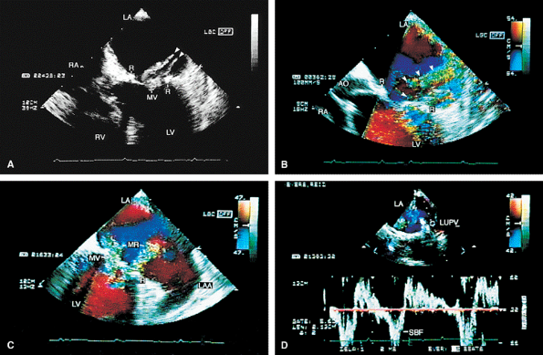 FIGURE 5.15. Mitral annuloplasty ring: ruptured chordae. A. Ruptured chordae (arrowheads) prolapsing into the left atrium (LA) in systole. R, mitral annuloplasty ring. B,C.Color Doppler examination demonstrates severe eccentric mitral regurgitation (MR) (arrowheads) through the ring with prominent systolic backflow (SBF) in the LUPV (D). AO, aorta; LAA, left atrial appendage; LUPV, left upper pulmonary vein; LV, left ventricle; MV, mitral valve; RA, right atrium; RV, right ventricle. |
