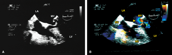 FIGURE 5.16. Mitral annuloplasty ring: obstruction. A,B. Prominent diastolic flow acceleration (arrow) and a narrow inflow jet resulted from obstruction produced by a Duran ring in this patient. LA, left atrium; LV, left ventricle; MV, mitral valve; RA, right atrium; RV, right ventricle. |