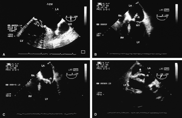 FIGURE 5.17. Mitral annuloplasty ring: thrombus/dehiscence. A. A thrombus (arrow) involving the ventricular aspect of a Duran ring. There is severe mitral valve (MV) prolapse. B–D. Another patient with a flail Duran ring (R) and thrombus formation (arrow in D). In B the flail ring is shown in systole in the left atrium. C. Another systolic frame, showing the ring now prolapsing into the ventricle. In this patient, the Duran ring had dehisced and was attached only by a single remaining suture. AO, aorta; LA, left atrium;LV, left ventricle; RA, right atrium, RV, right ventricle. (Reproduced with permission from Osman K, Willman B, Nanda NC, et al. Transesophageal echocardiographic findings of a dehisced duran mitral annuloplasty ring. Echocardiography 1995;12:441–446. ) |