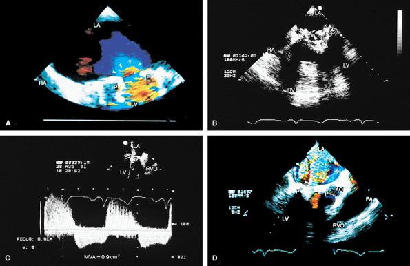 FIGURE 5.19. Porcine mitral prosthesis: stenosis and regurgitation. A. A large diastolic flow acceleration (arrowheads) on the atrial side of the prosthesis (P), suggesting the presence of obstruction. B. Thickening and calcification of the prosthesis resulting from degeneration. C. A decreased slope of the diastolic velocity profile with a measured mitral valve area (MVA) of 0.9 cm2 measured by the pressure half-time technique, indicating significant obstruction. D. Associated severe valvular mitral regurgitation (MR) (arrowheads). Images B through D are from the same patient. AO, aorta; LA, left atrium; LV, left ventricle; PA, pulmonary artery; RA, right atrium; RV, right ventricle; RVO, right ventricular outflow tract. |