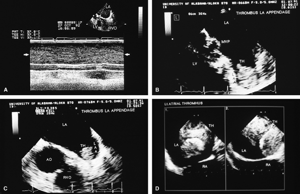 Thrombi can lead to emboli or to obstruction or may interfere with the function of a valve and cause significant regurgitation. Thrombi may be present in the left atrium or left atrial appendage and may well be seen on the transesophageal study. Because the left atrial appendage may be partially or completely removed at the time of surgery, inability to image it should not be taken as evidence that there is a clot obscuring the appendage. Left ventricular function is better preserved if the papillary muscles are not completely removed; remnants of the papillary muscle and chordae left in place by the surgeon may be mistaken for a mobile clot. For this reason, a baseline transesophageal study is of great use for comparison.