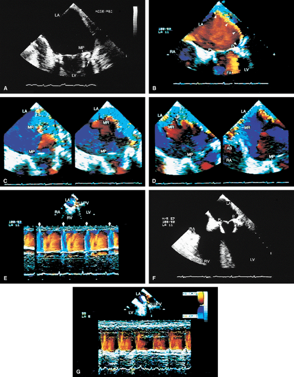 FIGURE 5.21. Porcine mitral prosthesis: paravalvular regurgitation. A. A laterally located area of prosthetic (MP) dehiscence (arrow). B–D. An eccentric jet of mitral regurgitation (MR) (arrowheads) originating in the area of prosthetic (P) dehiscence. E. Color M-mode demonstrates systolic backflow (arrows) in the left upper pulmonary vein (LUPV), indicative of severe MR. After repair, the dehisced area is no longer seen (F), and there is absence of systolic backflow in LUPV (G). AS, atrial septum; FA, flow acceleration; LA, left atrium; LV, left ventricle; RA, right atrium; RV, right ventricle. |