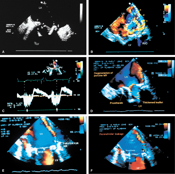 FIGURE 5.22. Porcine mitral prosthesis: paravalvular and valvular regurgitation. A. Thickened prosthetic (P) leaflets (arrowhead) and a large area of lateral dehiscence (arrow). B. Valvular and paravalvular mitral regurgitation (MR) (arrowheads). C. Prominent systolic backflow (arrows) is noted in the left upper pulmonary vein (LUPV). D–F.Another patient with thickened prosthetic (MVR) leaflets, prominent diastolic flow acceleration, and lateral paravalvular regurgitation (arrows). The MR jet is narrow as a result of the Coanda effect, caused by the jet impinging against the left atrium (LA) lateral wall. Systolic backflow was present in the LUPV, however, indicative of severe MR. This was confirmed by angiography. LV, left ventricle; RVO, right ventricular outflow tract; RA, right atrium. |