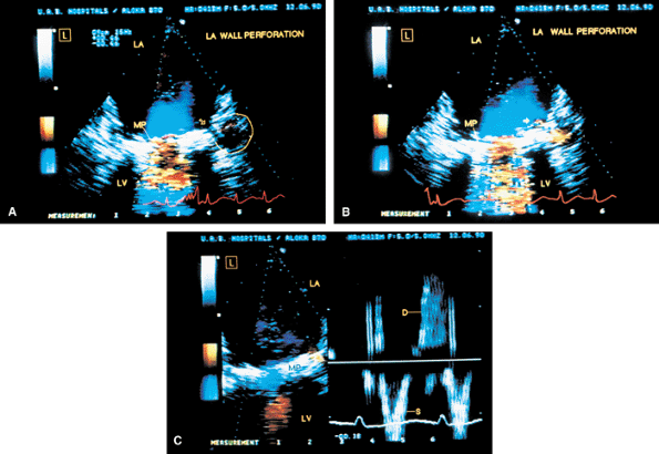 FIGURE 5.26. Porcine mitral prosthesis: left atrial pseudoaneurysm. Apical two-chamber view (longitudinal plane examination). A. A narrow, 2-mm wide channel (arrow) is seen extending from the left atrium (LA) into a 1.3-cm pseudoaneurysm cavity (circled). B. A diastolic frame shows color-flow signals moving from the pseudoaneurysm into the left atrium during diastole (arrow). C. Pulsed-Doppler examination shows to-and-fro motion of blood flow signals, which move into the pseudoaneurysm during systole and out of it into LA during diastole. MP, mitral prosthesis; LV, left ventricle. (Reproduced with permission from Ballal R, Nanda NC, Sanyal R. Intraoperative transesophageal echocardiographic diagnosis of left atrial pseudoaneurysm. Am Heart J 1992;123:217–218. ) |
