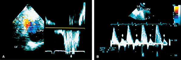 FIGURE 5.27. Porcine mitral prosthesis: regurgitation. A. Color Doppler–guided pulsed Doppler interrogation of left upper pulmonary vein (LUPV) demonstrates prominent systolic backflow (arrow), indicative of severe mitral regurgitation (MR). Because LUPV is dilated, there is systolic swirling of blood flow, with forward flow (red) seen medially and backflow (blue) more laterally. Color guidance is important for placing the pulsed Doppler sample volume in the blue and not in the red flow signals to demonstrate systolic backflow diagnostic of severe MR. B. Reduced S wave (arrows) suggests moderate MR in another patient. There is no systolic backflow. LV, left ventricle; LA, left atrium. |