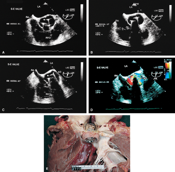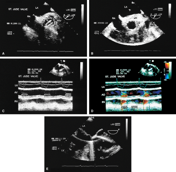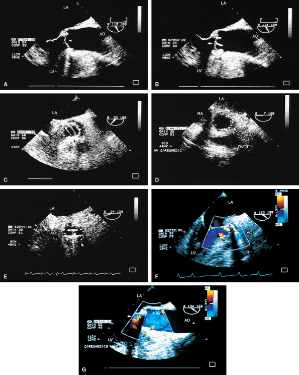 Certain structures are well examined by transesophageal echocardiography. The short-axis view of a prosthetic valve permits a complete view of the valve suture line. Stents are well seen, and, in the case of mitral prostheses, may physically narrow the left ventricular outflow tract or may impinge on the left ventricular free wall or ventricular septum, producing arrhythmias or conduction system abnormalities. Bioprosthetic mitral cusp rupture resulting from degeneration or infection may be manifested as linear echoes protruding into the left atrium, with or without fluttering. Left atrial perforation or dissection may be seen. Abscesses may be visualized. They may be large and filled with pus. The presence of flow signals in the abscess cavity demonstrates that there is communication with an adjoining vessel or cavity. Abscesses may form fistulas to other structures. Following aortic valve replacement, systolic anterior motion of the mitral valve may be unmasked, and significant left ventricular outflow tract obstruction may develop in the presence of coexisting hypertrophic cardiomyopathy. Rarely, a left ventricular outflow tract gradient may be caused by an abscess narrowing the outflow tract. Pannus may cause obstruction and may be difficult to distinguish from clot. If the obstructing echo density is mobile and less dense thrombus is more likely. Bioprosthetic valves may suffer cusp degeneration or calcification, which may produce obstruction. Linear echoes protruding into the left ventricular outflow tract are characteristic of prolapse caused by bioprosthetic aortic valve degeneration. Similar echoes may also be caused by infection.