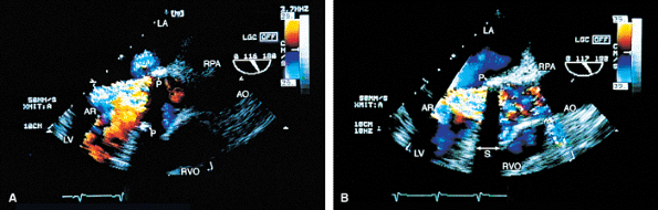 FIGURE 5.42. Porcine aortic prosthesis: paravalvular regurgitation. A. The arrow points to a mildly thickened porcine aortic valve (PAV). B. Eccentric paravalvular aortic regurgitation (AR) (arrow) originating in the vicinity of the posterior prosthetic stent (S). There is no valvular regurgitation. AO, aorta; LA, left atrium; LV, left ventricle; MV, mitral valve; RV, right ventricle. |