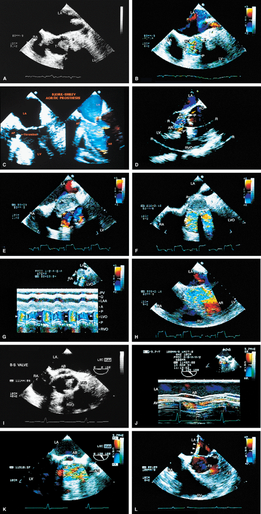 FIGURE 5.32. Bjork-Shiley aortic prosthesis: thrombus/dehiscence/abscess. A,B. A large thrombus (T) involving the aortic prosthesis (P). C. Another patient with a thrombus on the aortic prosthesis (AP) and severe associated aortic regurgitation (AR). Diastolic mitral regurgitation (MR) caused by severe AR is also noted. D. Paravalvular AR caused by dehiscence of prosthetic (P) sutures (arrow). Note the presence of two arc-like side lobe artifacts (R). E–H. A large abscess (A) involving the prosthesis (P) posteriorly together with severe AR (arrowheads in G). I–K. Another patient with an abscess cavity (AB) located on the posterior aspect of the prosthesis (PAV) and communicating with the left ventricular outflow tract (LVOT) (K). L. A patient with an infected Bjork-Shiley prosthesis with associated perforation at the base of the anterior mitral leaflet. The arrowheads demonstrate the MR jet moving through the perforation. The large flow acceleration (FA) suggests the presence of severe MR, although the jet through the perforation appears small. Note a second tiny MR jet arising from the coaptation point. AO, aorta; LA, left atrium; LAA, left atrial appendage; LVO, left ventricular outflow tract; LV, left ventricle;MV, mitral valve; RA, right atrium; RV, right ventricle; RVO, right ventricular outflow tract. (Reproduced with permission from Mahan EF III, Nanda NC. Transesophageal echocardiography. In: Rackley CE, ed. Challenges in Cardiology I. Mt. Kisco, NY: Futura, 1991:85–101. ) |