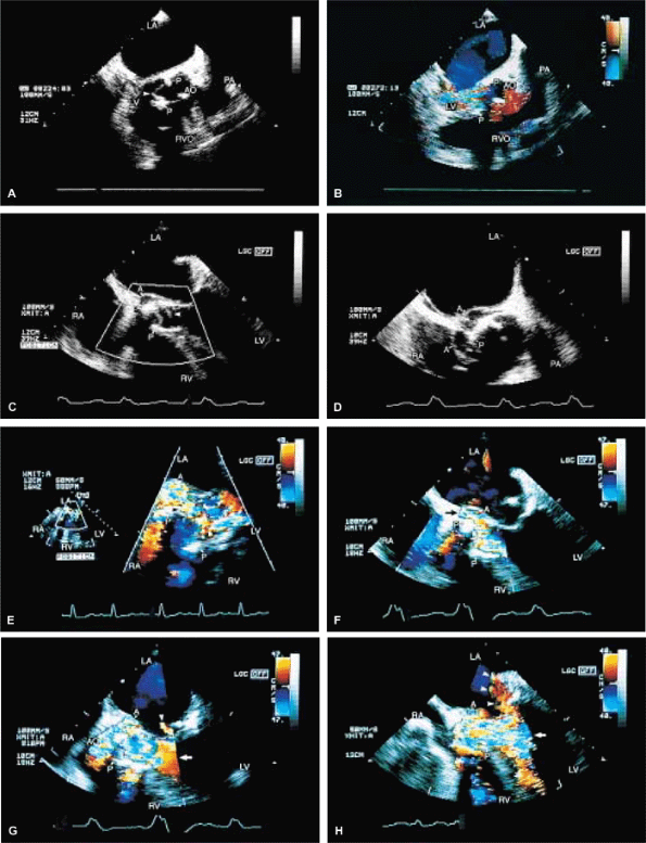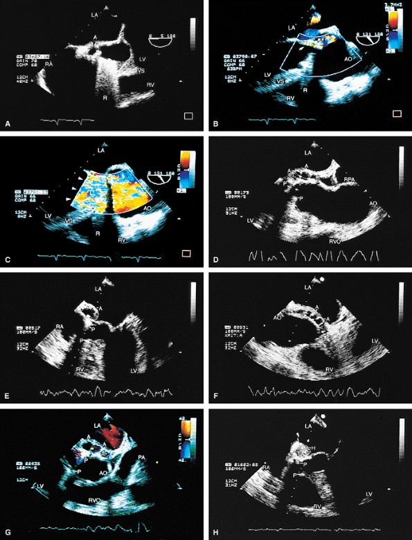 FIGURE 5.35. Medtronic-Hall prosthesis: abscess/paravalvular leak. A. A large abscess cavity (A) is noted in the area of the prosthesis. R, a prominent reverberation artifact.B. Eccentric paravalvular aortic regurgitation (AR) (arrow), with prominent flow acceleration on the aortic side of the valve. C. Severe AR (arrowheads) with some proximal acoustic shadowing is noted. D–G. Another patient with multiple abscesses (A) involving the prosthesis (P). An abscess (A) encroaches on the anterior mitral leaflet (E). G. Color Doppler examination shows flow signals within the abscess cavity, indicating communication with the aorta (AO) or left ventricle (LV). This patient underwent homograft replacement of the infected Medtronic-Hall prosthesis. H. A small hematoma (H) is noted posterior to the prosthesis (P) in the postoperative study. LA, left atrium; RA, right atrium; RV, right ventricle; RPA, right pulmonary artery; RVO, right ventricular outflow tract; VS, ventricular septum. |