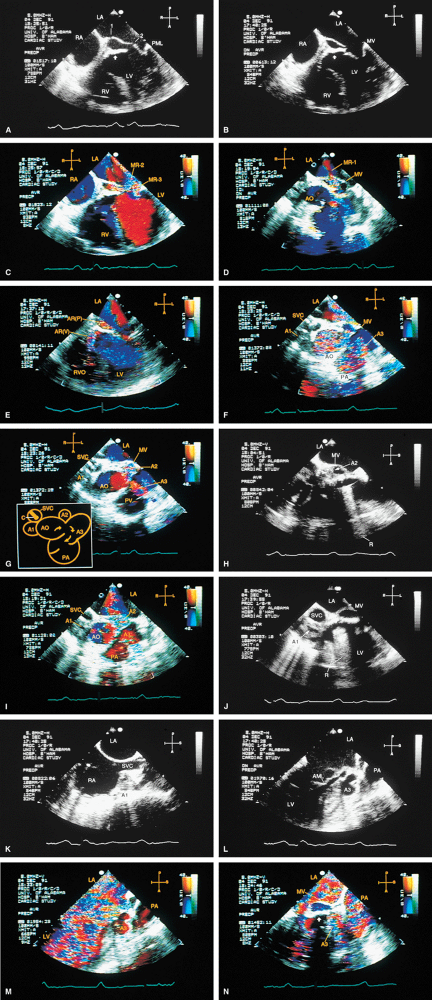 FIGURE 5.36. Medtronic-Hall prosthesis: abscess/aortopulmonary fistula. A–E. The modified four-chamber and five-chamber views demonstrate a portion of the aortic prosthesis (arrow) protruding into the left ventricular outflow tract (LVOT). The anterior leaflet of the mitral valve (MV) shows two perforations, one at the base (1) and the other in the midportion (2). Mitral regurgitation (MR) jets are seen moving into the left atrium (LA) through these perforations (MR-1, MR-2) and also from the coaptation area of the mitral leaflets (MR-3). B. The diastolic frame shows the prosthesis in contact with the body of the anterior mitral leaflet (AML) in the area of the perforation. E. Both valvular (V) and paravalvular (P) aortic regurgitation (AR) are noted. F,G. Modified aortic short-axis views demonstrate the fistulous connection between the aortic root (A) and the main pulmonary artery (PA) through an abscess cavity (A3). Two other abscess cavities (A1, A2) are also noted. H,I. Abscess cavity A2 is well demonstrated. J,K. The relationship of the abscess cavity A1 to the superior vena cava (SVC) during transverse (J) and longitudinal (K) plane examinations is demonstrated. L–N. Longitudinal plane examination shows the abscess cavity A3. Its communication with the PA is seen in N. AO, aorta; LV, left ventricle; PML, posterior mitral leaflet; RA, right atrium; RV, right ventricle; RVO, right ventricular outflow tract; SVC, superior vena cava. (Reproduced with permission from Chen CH, Nanda NC, Fan PH, et al. Transesophageal echocardiographic diagnosis of aortopulmonary fistula. Echocardiography 1993;10:85–90. ) |
