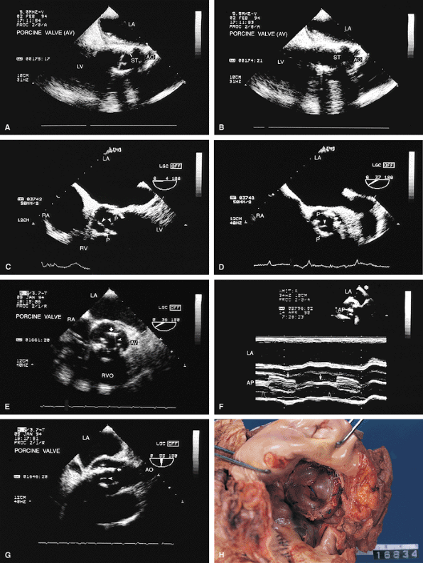 FIGURE 5.37. A–H. Porcine aortic prosthesis: normal. The leaflets (A, arrowheads in C–E and G, arrow in F) and the stents (ST, arrows in E and G) of the prosthesis (P) are well seen. Because the metallic stents are highly echogenic, they may obscure the thin leaflets. It may be necessary to use multiple transducer angulations to see the leaflets as completely as possible. F. M-mode tracing of the prosthesis (AP) shows it in the open and closed position (arrows). H. Gross specimen of a normal porcine prosthesis in the aortic position. AO, aorta; LA, left atrium; LV, left ventricle; RV, right ventricle; RVO, right ventricular outflow tract. |