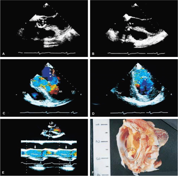FIGURE 5.40. Porcine aortic prosthesis: cusp rupture. The arrowheads in A and B show a ruptured cusp prolapsing into the left ventricular outflow tract (LVOT), with severe aortic regurgitation (AR) shown in C through E (arrowheads in D, arrows in E). Diastolic mitral regurgitation (MR) (arrowheads) from severe AR is noted in C. F is a gross specimen of a thickened and calcified porcine aortic valve with cusp rupture (circled). AO, aorta; LA, left atrium; LV, left ventricle; P, prosthesis; RA, right atrium; RV, right ventricle. |