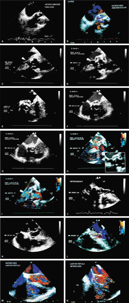 FIGURE 5.43. Porcine aortic prosthesis: abscess/fistula. A,B. A large abscess cavity is noted posteriorly communicating with the left ventricular outflow tract (LVOT). AP, aortic prosthesis; P, prosthesis. C–I. Another patient with a large abscess cavity (A, AB, arrow in G) located on the posterior aspect of the prosthesis (P, AP). H,I. Color Doppler studies in the same patient show the abscess cavity communicating with the LVOT in diastole (H) and systole (I). J–L. Another patient with a heterograft who has a rounded abscess cavity, best seen in K (arrow), protruding into the left atrium (LA) and close to the aortic–mitral junction. J. The prosthetic leaflets (closed arrow) and the stents (open arrows) do not appear to be abnormally thick. L. Color Doppler examination shows the presence of significant aortic regurgitation (AR). M,N. Another patient with an infected porcine prosthesis showing a fistula into the right ventricle (RV) (arrows). AO, aorta; LV, left ventricle; MR, mitral regurgitation; MV, mitral valve; RA, right atrium; RVO, right ventricular outflow tract. |