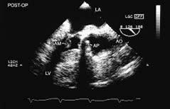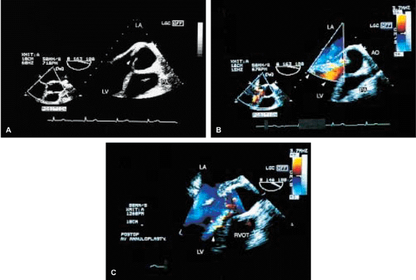 Transesophageal echocardiography is also useful in the assessment of mitral annuloplasty rings, which are placed to reduce the severity of mitral regurgitation. Residual mitral regurgitation, as well as ring thrombus, obstruction, and dehiscence, are well demonstrated. Systolic anterior motion of the anterior mitral leaflet with left ventricular outflow tract obstruction may also occur after ring placement and can be diagnosed by echocardiography. In patients undergoing aortic valvuloplasty, the site of aortic valve repair and the severity of residual aortic regurgitation are also well assessed by transesophageal echocardiography.