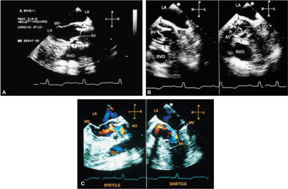 FIGURE 5.48. Homograft aortic prosthesis: subaortic obstruction produced by abscess. Longitudinal (A) and transverse (B) plane examinations showed abscess cavity (arrows) and narrowing of left ventricular outflow tract (LVOT) more clearly than did a transthoracic study. The abscess cavity communicates with LVOT posteriorly; anteriorly, it appears closed. Homograft aortic valve (AV) leaflets are only mildly thickened. C. Left panel. a systolic frame shows aliasing and narrowing of the flow channel in LVOT, indicative of subaortic obstruction (longitudinal plane examination). Right panel. a diastolic frame shows color Doppler flow signals occupying <25% of the proximal LVOT, consistent with mild aortic regurgitation (AR) (transverse plane examination). AO, aorta; LA, left atrium; LV, left ventricle; LVO, left ventricular outflow tract; MV, mitral valve;RVO, right ventricular outflow tract. (Reproduced with permission from Sanyal RS, Roychoudhury D, Nanda NC, et al. Transthoracic and transesophageal echocardiographic diagnosis of severe subaortic obstruction produced by an abscess cavity. Am Heart J 1994;128:1252–1255. ) |