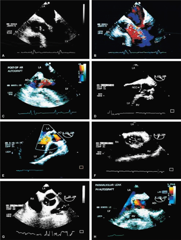 FIGURE 5.49. Pulmonary autograft in the aortic position with homograft replacement of the pulmonary valve (PV) (Ross operation): prolapse/valvular and paravalvular regurgitation. A. Prolapse (arrowhead) of the prosthesis (P) placed in the aortic position. B,C. Severe posteriorly directed eccentric regurgitation (arrows). D–F. Another patient with prolapse of the autograft. The arrow in D shows noncoaptation caused by severe prolapse of the noncoronary cusp (NCC). Resulting severe aortic regurgitation (AR) (arrow) with prominent flow acceleration is seen in E. The arrow in F points to redundancy and noncoaptation of the prosthetic leaflets viewed in short axis. G. Another patient with an autograft who has a hole (upper arrow) in the right coronary cusp. The homograft pulmonary valve (lower arrow) in this patient is mildly thickened. H. Another patient with a pulmonary autograft in the aortic position with suture dehiscence and a posterior paravalvular leak. AO, aorta; LA, left atrium; LV, left ventricle; RA, right atrium; RV, right ventricle; RVOT, right ventricular outflow tract; VS, ventricular septum. |