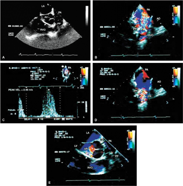 FIGURE 5.52. Pulmonary valve prosthesis. A prosthesis (PP) is shown in the pulmonary position in this patient, who also had repair of a ventricular septal defect (arrows inA,E). B. Turbulent flow (arrow) in the pulmonary artery (PA) in systole. The peak velocity by continuous wave Doppler measured 2.48 m/sec (C), which is within normal limits for a prosthetic valve. D. Associated severe pulmonary regurgitation (PR) is shown. E. This patient also had moderate aortic regurgitation (AR). AO, aorta; AV, aortic valve; LA, left atrium; LM, left main coronary artery; LV, left ventricle; RVO, right ventricular outflow tract. |