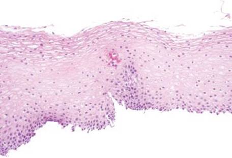 Figure 1.54 HSV esophagitis. Cells suspicious for HSV viral cytopathic effect are seen at the base.