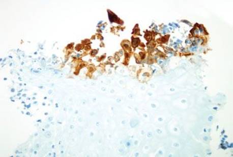 Figure 1.55 HSV esophagitis (HSV immunostain). The corresponding HSV immunostain highlights the virally infected cells.
