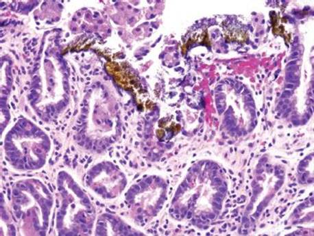 Ferrous sulfate-mediated corrosive injury is seen in approximately 1% of individuals undergoing upper endoscopy and is associated with erosions and ulceration.10 The pigment can have a coarse, crystalline, or subtle brown hue on H&E, and it is blue on a Prussian blue iron special stain (Figs. 1.62–1.66). Recognition is important to help prevent further injury and potential stricture formation. These patients benefit from behavioral modifications such as maintaining upright posture for 30 minutes after taking the pill and/or taking the pill with ample liquids or food. See also Pigments and Extras, Stomach Chapter.