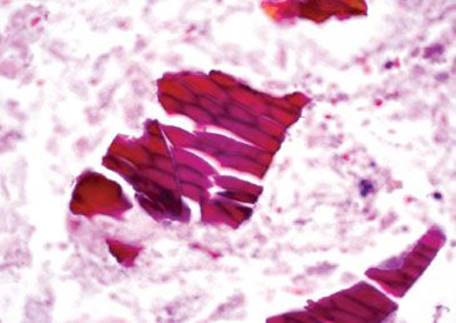 Figure 1.70 Kayexalate (sodium polystyrene sulfonate). Alternate case. The purple color and narrow, regular “fish-scales” are consistent with Kayexalate.