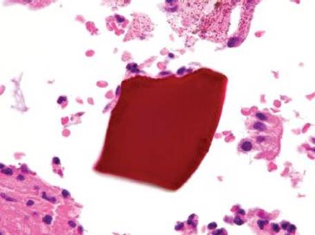 Figure 1.90 Cholestyramine. Note the characteristic smooth and glassy texture, and bright orange color on H&E. Bile acid sequestrants are known by many names: Cholestyramine (LoCholest, Prevalite, Questran); colestipol (Colestid); colesevelam (WelChol).