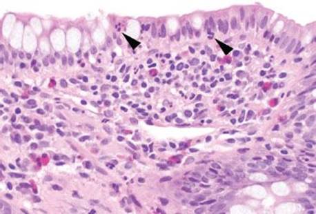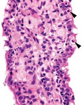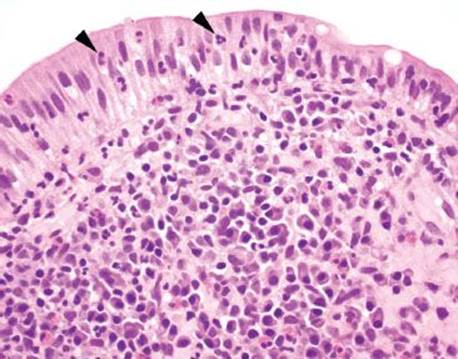 Figure 3.51 Acute ileitis pattern. Acute ileitis refers to acute inflammation in the epithelium of the ileum (arrowheads). It is most commonly caused by medication, infection, and inflammatory bowel disease.