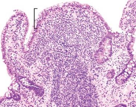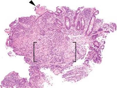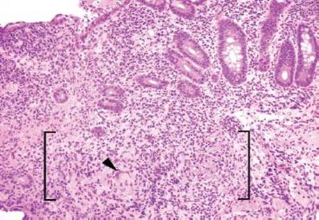 Figure 3.61 Acute ileitis pattern, erosive active chronic granulomatous ileitis, Crohn disease. Active chronic inflammation refers to acute injury (i.e., acute inflammation in the epithelium or crypt lumens, erosions, and or ulcerations) and chronic injury. In this case, an erosion is seen (arrowhead) along with an expansion of the lamina propria by a lymphohistiocytic inflammation (brackets).