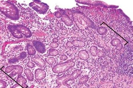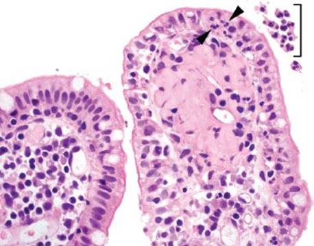 Figure 3.54 Acute ileitis pattern. A pocket of luminal neutrophils is seen (bracket) along with acute inflammation in the epithelium (arrowheads).