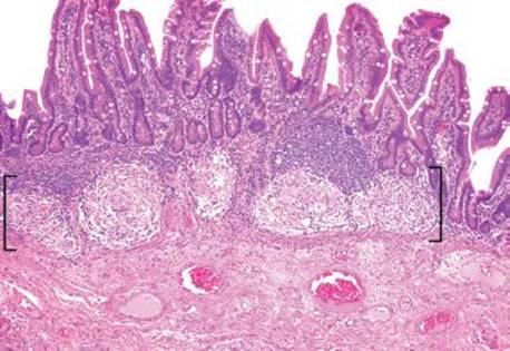 Figure 3.58 Granulomatous pattern (brackets), terminal ileum, sarcoidosis. This terminal ileum resection originated from a 58-year-old woman with an extensive history of sarcoidosis who presented with a small bowel obstruction. The background mucosa was unremarkable. AFB and GMS special stains were negative.