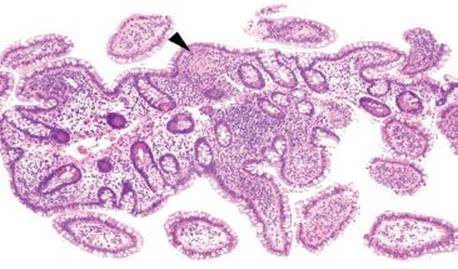 Figure 3.59 Acute ileitis pattern, granuloma, Crohn disease. This sneaky granuloma is almost miss-able on low power (arrowhead). This biopsy originated from a patient with a history of Crohn disease and scattered mucosal granulomata were seen throughout representative upper and lower gastrointestinal tract biopsies.