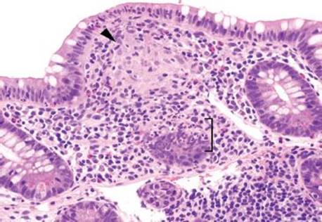 Figure 3.60 Acute ileitis pattern, granuloma, Crohn disease. On higher power, the granuloma is more easily spotted (arrowhead) as is the focal acute inflammation in the adjoining epithelium (bracket). AFB and GMS special stains were negative.