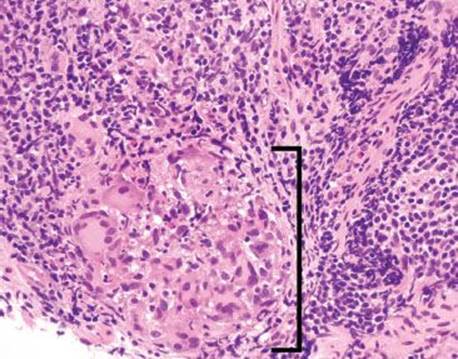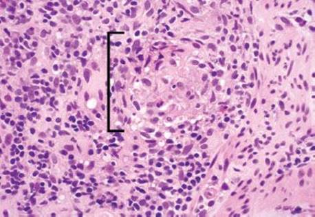Figure 3.63 Acute ileitis pattern, erosive active chronic granulomatous ileitis, Crohn disease. On highest power, the epithelioid morphology characteristic of granulomatous inflammation is seen (bracket). AFB and GMS special stains were negative.
