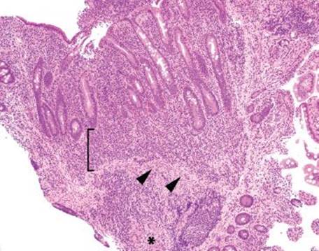 Figure 3.64 Acute ileitis pattern, active chronic granulomatous ileitis, Crohn disease. At low power, crypt shortfall with basal lymphoplasmacytosis is seen: note that the crypts fall short of the muscularis mucosae (arrowheads) because of a basal layer of lymphoplasmacytic inflammation (bracket). Granulomata in Crohn disease (asterisk) can be notoriously difficult to appreciate in intensely inflamed specimens, as in this case. In contrast to normal terminal ileum architecture, note that it would be impossible to strip off the overlying epithelium in this case since the epithelium is inseparably melded to the associated active chronic inflammatory injury. Contrast this image with normal architecture (Figs. 3.20–3.25).