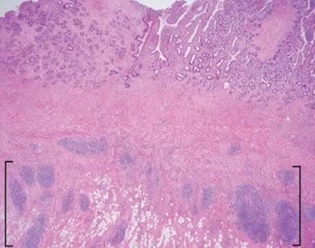 Figure 3.66 Acute ileitis pattern, active chronic ileitis, Crohn disease. Active chronic injury implies both acute and chronic inflammatory injury. Although acute inflammation is not apparent at this magnification, features of established chronic injury (chronicity) include pyloric gland metaplasia (best appreciated at higher power) and architectural distortion (note the variably sized crypts with variable intervening lamina propria). Also note the transmural fibrosis and chronic inflammation, and subserosal lymphoid aggregates (brackets), features compatible with the history of established Crohn disease.