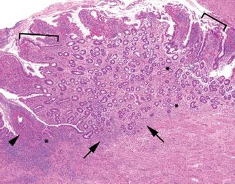 Figure 3.67 Acute ileitis pattern, ulcerative active chronic ileitis, Crohn disease. This resection is from a patient with a history of terminal ileum-restricted Crohn disease. The image features both acute injury (ulceration (arrowhead) and acute inflammation in the epithelium (not shown)) and chronic injury (gastric foveolar metaplasia [brackets], pyloric gland metaplasia [asterisks], and slight architectural distortion with variably sized crypts, variable intervening lamina propria, minimal crypt shortfall, and basal lymphoplasmacytosis [arrows]).