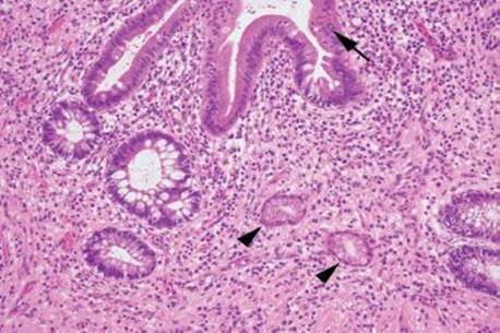 Figure 3.71 Acute ileitis pattern, active (arrow) chronic (arrowheads) ileitis, Crohn disease.