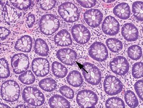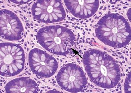 Figure 4.16 Focal active colitis pattern. Except for an isolated collection of neutrophils invading the crypt epithelium (arrow), this colonic biopsy appears essentially normal; the background crypts are evenly spaced and orderly.