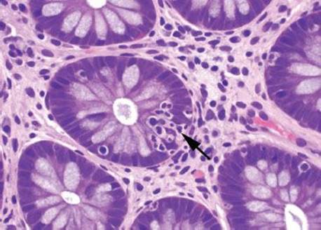 By definition, acute self-limited colitis is one that resolves in less than 4 weeks. An identifiable infectious agent is found in approximately half of cases, the most common pathogens of which are Campylobacter jejunales,Salmonella, Shigella, and Yersinia. Clinical clues favoring infectious colitis include acute onset, fever within the first week of disease onset, and at least 10 bowel movements in a 24-hour period. By contrast, the majority of patients eventually diagnosed with IBD have a more insidious onset, lack a fever within the first week of onset, and have no more than six bowel movements in a 24-hour period. The remaining cases of acute self-limited colitis for which stool cultures are negative are the result of viral infection, parasitic infection, medication reaction, or other chemical irritants. Histologically, biopsies show a predominantly acute inflammation restricted to the mucosa in either a patchy or diffuse fashion. Erosions, ulcerations, and neutrophilic involvement of crypt epithelium (cryptitis) and crypt lumens (crypt abscesses) may be seen, but features of chronicity (e.g., crypt distortion, crypt dropout, crypt shortfall, increased lamina propria chronic inflammation) are absent.