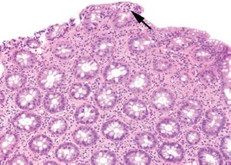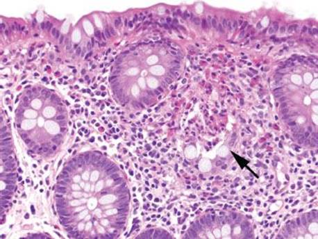 A diagnosis of inflammatory bowel disease (IBD) may be rendered if additional histologic features, such as mucosal distortion, chronic inflammation of the lamina propria, or epithelioid granulomas are present.4 Often, however, these additional features are insufficiently developed to establish a clear-cut diagnosis of IBD. Although FAC may be a harbinger to IBD, especially in children, there is a preponderance of acute self-limited colitis, antibiotic-associated colitis, and medication injury among these patients.
