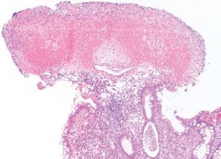 Figure 4.83 Pseudomembranous pattern, early. The eruptive pseudomembrane is hard to miss, even at low magnification. Interestingly, the background mucosa sometimes shows little to no change, as seen here.
