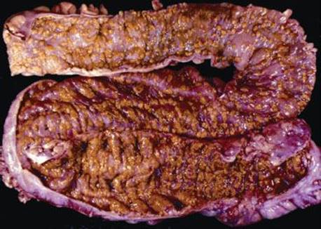 Figure 4.80 Pseudomembranous pattern, C. difficile. Histologically, distinguishing ischemic pseudomembranes from C. difficile pseudomembranes can be impossible. However, the gross distribution of disease in C. difficile colitis is diffuse (pictured here), whereas ischemic colitis is typically segmental.