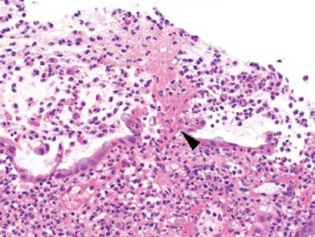 Figure 4.82 Pseudomembranous pattern, early. Higher magnification of the previous case shows the fibrin (arrowhead) erupting from the colonic surface amidst numerous neutrophils.