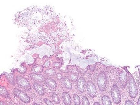 Figure 4.79 Pseudomembranous pattern. This fibrin cap along the surface of the colonic mucosa is the hallmark of pseudomembranous pattern.