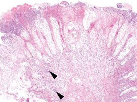 Figure 4.84 Pseudomembranous pattern, marked. Severe cases of pseudomembranous colitis may require colectomy, as in this case. There is extensive tissue necrosis and only rare residual crypts (arrowheads) remain.