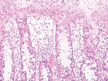 • Histologic features are primarily an acute colitis with pseudomembrane formation. Ballooned and exploding crypts with volcanic exudate may be seen (Figs. 4.81–4.87)