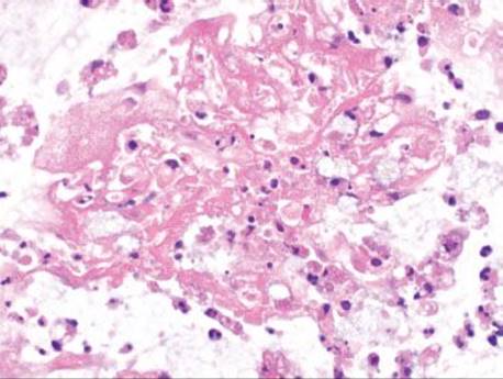 Figure 4.85 Pseudomembranous pattern. The crypt epithelium begins to slough and the lamina propria is edematous. The surface shows abundant fibrin and acute inflammatory cells.